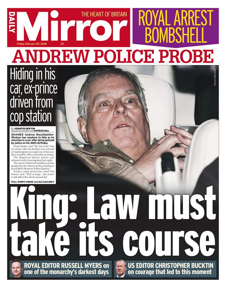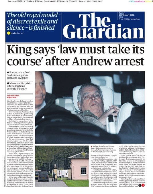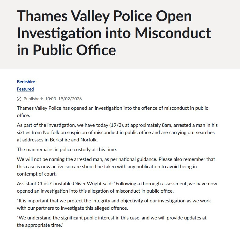On February 19, that thread broke. Rather than celebrating his 66th birthday, he was arrested by Thames Valley Police on suspicion of misconduct in public office (Note: while the police didn’t identify him, the King did in his own statement.)